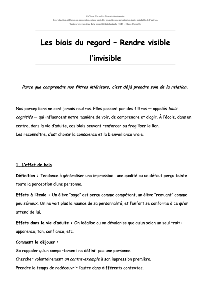 Nos perceptions passent par des filtres inconscients — effet Pygmalion, biais d’ancrage, de stéréotype… Apprendre à les reconnaître, c’est déjà prendre soin de la relation. Cet article invite à poser un regard conscient et ajusté, au cœur même de la pédagogie relationnelle Classe Cocon®.