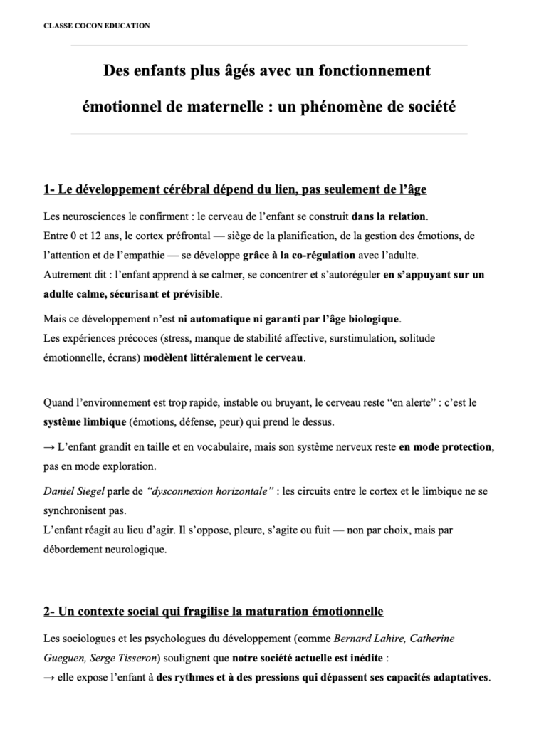 Les neurosciences affectives le confirment : le cerveau de l’enfant se construit dans la relation. Cet article analyse les effets du stress, des écrans, de la vitesse et du manque de lien sur le développement émotionnel, et montre comment Classe Cocon® y répond en recréant du rythme, du sens et du vivant.