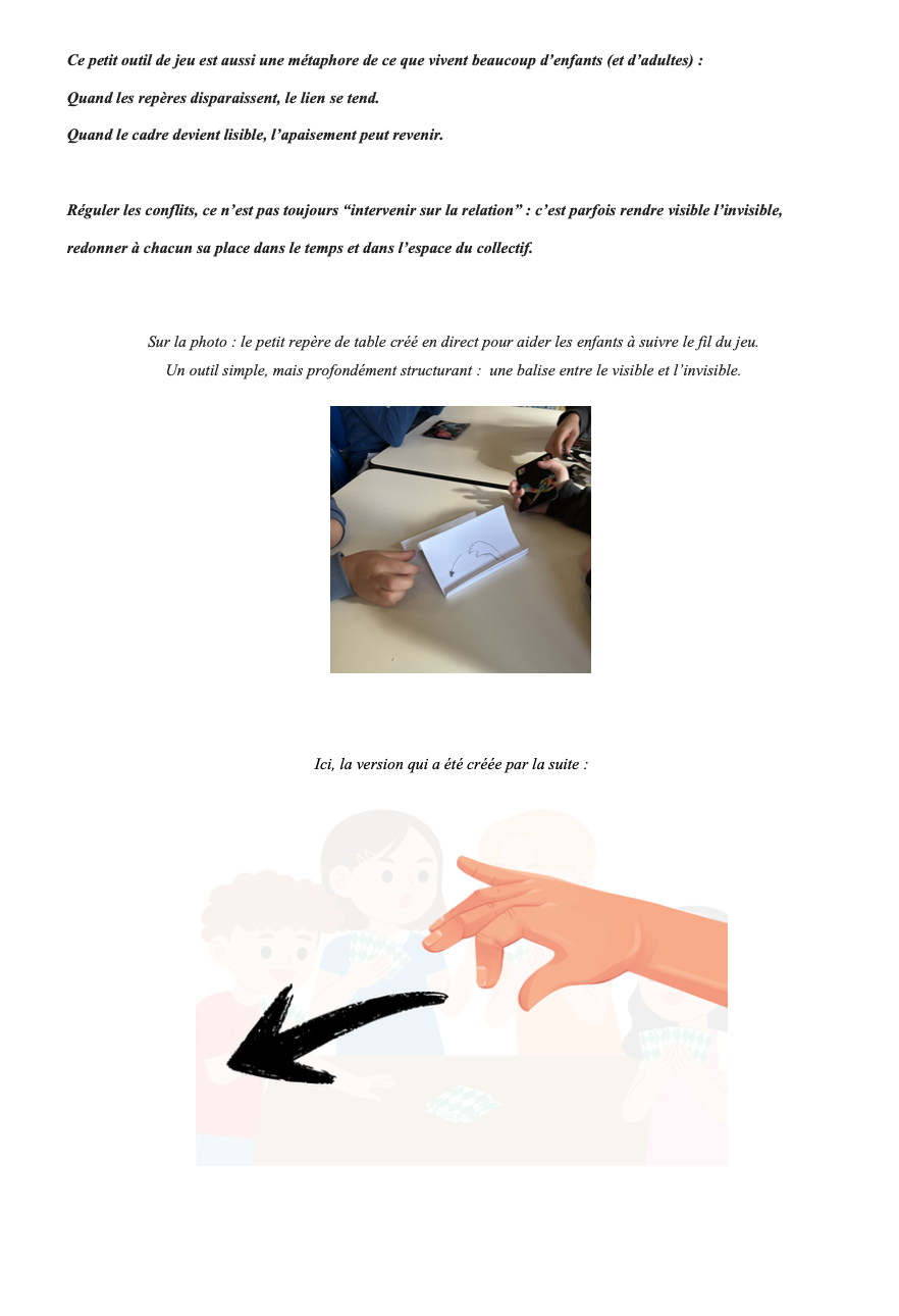Et si certaines tensions entre enfants ne venaient pas d’un désaccord, mais d’un simple manque de repères ? Cet article montre comment un petit outil visuel, né d’une partie de Mistigri, peut transformer le jeu en espace de sécurité intérieure et redonner à chacun sa place dans le temps collectif.