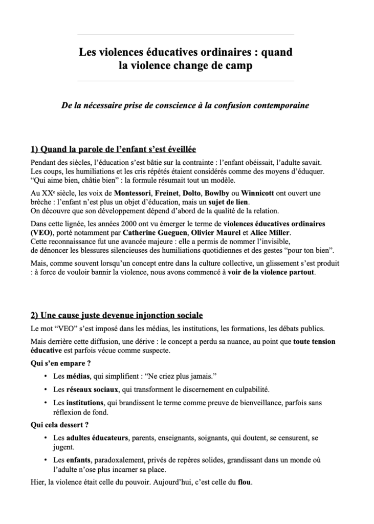 Cet article explore comment une cause juste – la lutte contre la maltraitance – a parfois fait perdre le discernement éducatif. Il rappelle que crier, frustrer ou ignorer parfois n’est pas blesser, mais parfois aider à grandir. Un texte pour redonner sens au pouvoir éducatif et restaurer la confiance dans une autorité incarnée, claire et humaine.