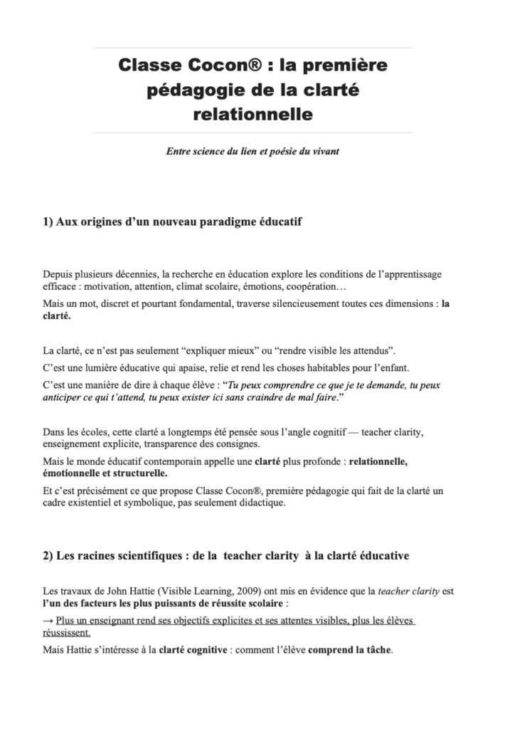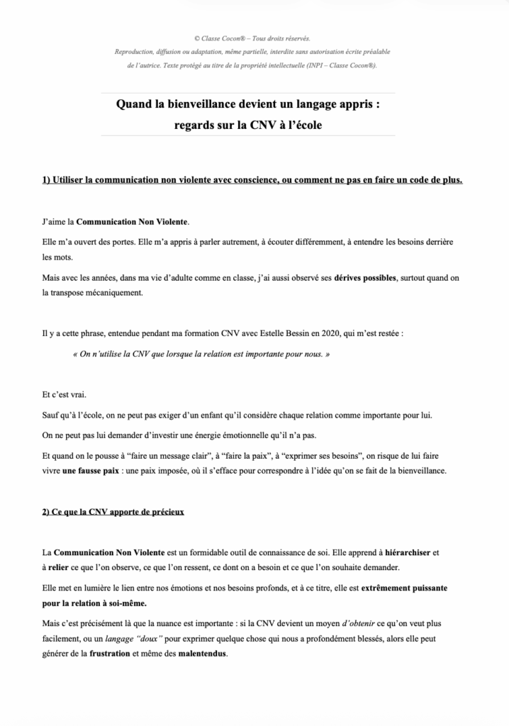 Et si la Communication Non Violente perdait sa force lorsqu’elle devient un code ? Cet article explore comment la pédagogie Classe Cocon® redonne à la CNV sa dimension vivante, incarnée et consciente , là où la parole redevient lien plutôt que formule.