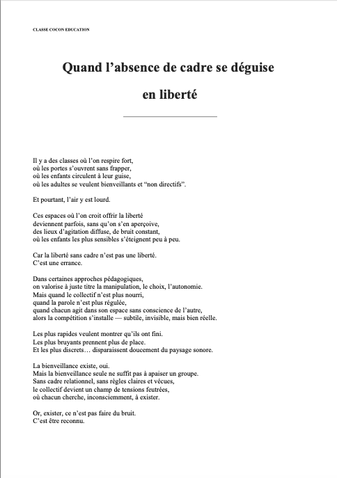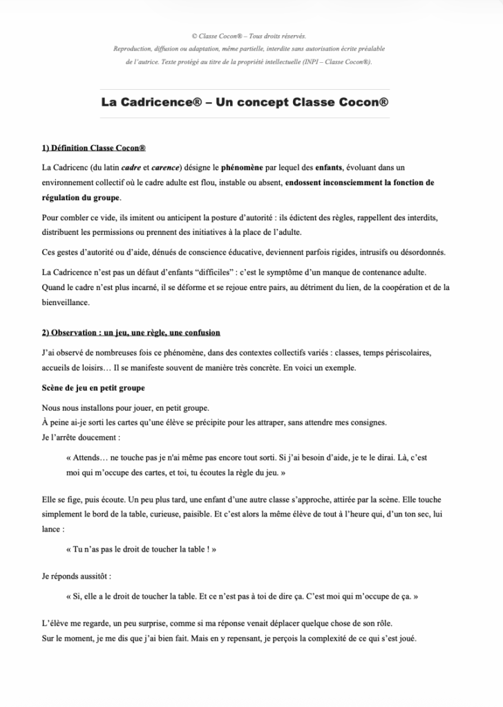 La Cadricence® explore ces instants où le cadre éducatif vacille, laissant certains enfants tenter de “tenir la classe” à la place de l’adulte. À travers une scène de vie et une analyse de terrain, cet article met en lumière l’importance d’un cadre incarné, stable et sécurisant, pilier essentiel de la pédagogie Classe Cocon®.